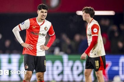 Shaqueel van Persie scored his first senior goals as the Feyenoord team managed by his father Robin suffered a late derby defeat by Sparta Rotterdam in the Eredivisie. With Feyenoord trailing 2-0 afte...