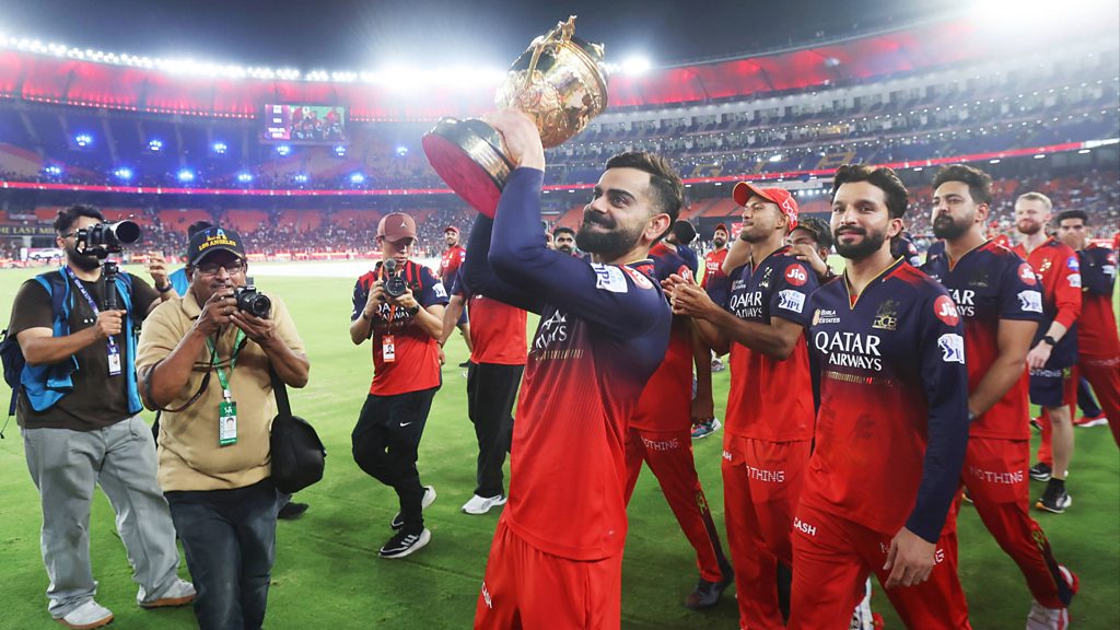 Image: Virat Kohli of Royal Challengers Bengaluru lifts the IPL trophy following the trophy presentation in the 2025 IPL Final match between Royal Challengers Bengaluru and Punjab Kings at Narendra Modi Stadium on June 03, 2025, in Ahmedabad, India. (Photo by Pankaj Nangia/Getty Images)