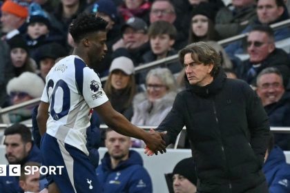 ‘At times like this it should be other people coming out to speak’ – Romeropublished at 14:06 GMT 14:06 GMT Tottenham v Aston Villa (Sat, 17:45 GMT) Tottenham Hotspur Tottenham capta...